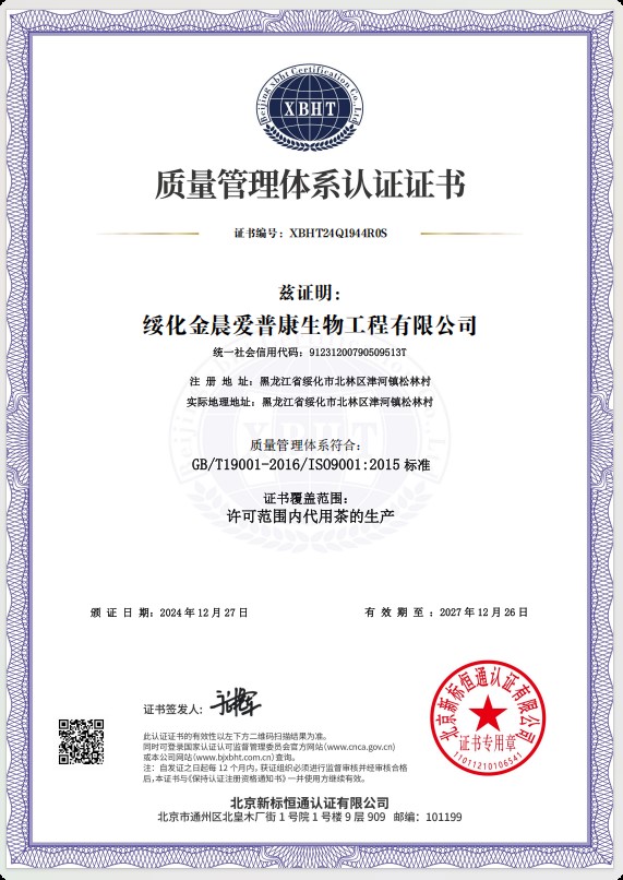 綏化金晨愛普康生物工程有限公司位于黑龍江省中南部地區(qū)的綏化市北林區(qū),所處位置東經124度,北緯45度,位于松嫩平原的呼蘭河流域,“有寒地黑土,塞北江南”的美譽,是全國重要的商品糧基地,屬中溫帶大陸性季風氣候,四季分明,雨熱同期,冬季冰雪覆蓋,夏季降雨集中氣候溫熱濕潤。綏化金晨愛普康生物工程有限公司是一家專業(yè)從事健康養(yǎng)生產品研發(fā)、生產及銷售企業(yè),公司占地總面積8000平方米,建筑面積5000平方米,公司周圍無任何污染源,是食品生產基地。公司生產車間潔凈度級別達到10萬級,同時擁有數十臺先進的生產設備及高科技檢驗儀器,從產品的原輔料、中間品、成品到銷售的全過程嚴格把關,使生產中每道工序都符合產品的高標準要求,從而保證了公司生產的每一袋產品合格,無質量缺陷。綏化金晨愛普康生物工程有限公司率先采用了企業(yè)資源ERP管理系統,肩負著養(yǎng)生產業(yè)的重要課題,同時又是江蘇省國家藥用植物重點實驗中心科研成果轉化的生產試驗基地,公司核心成員均為本科以上學歷。生產的產品有近五十個品種的代用茶產品,公司先后通過HALAL國際認證,編號為SSPY-201318-33849;ISO9001質量管理體系認證編號為XBH···